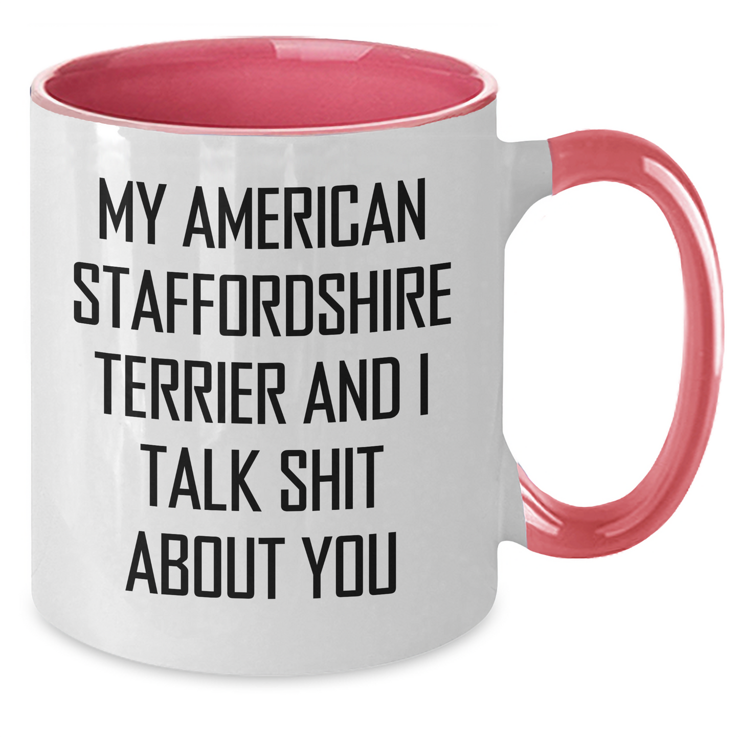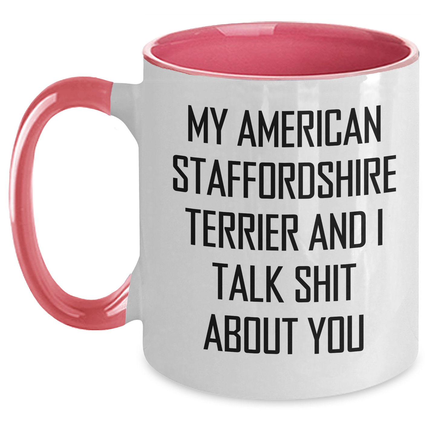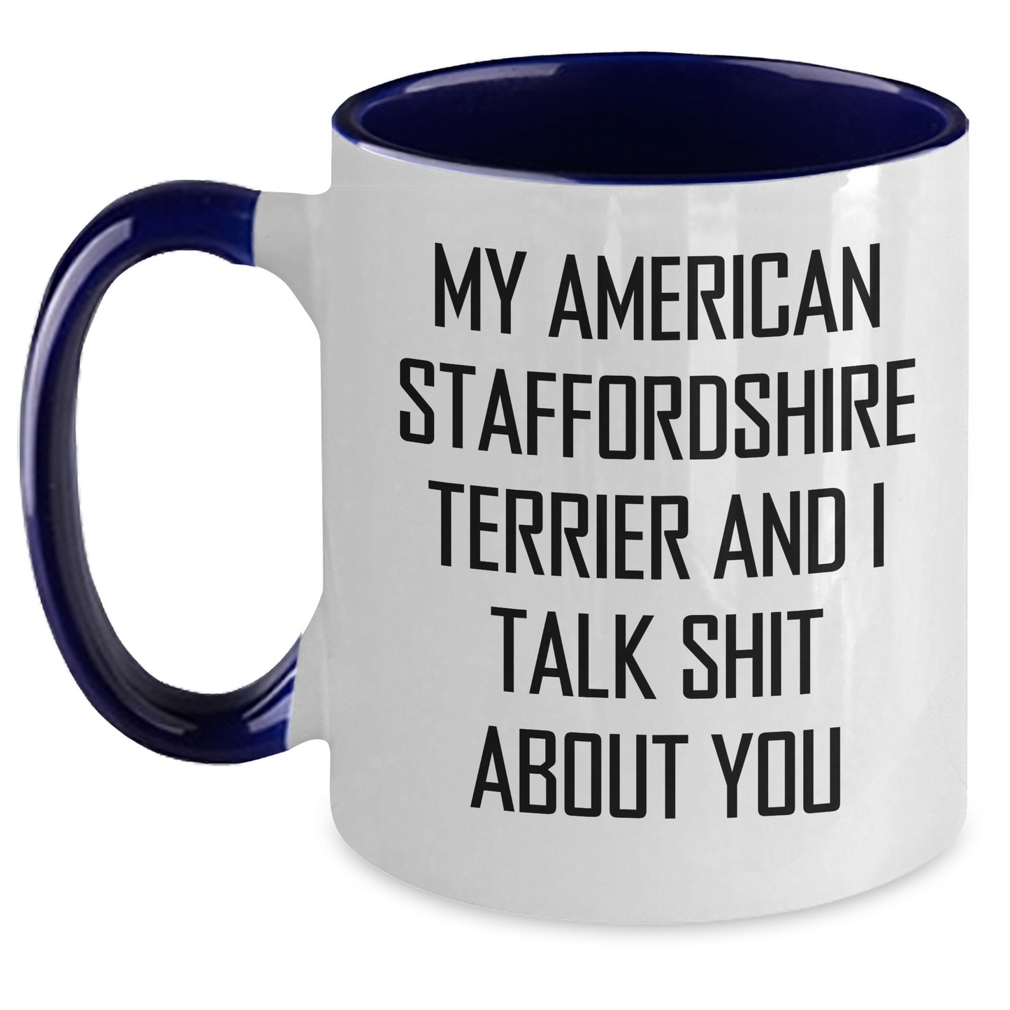 - Unique and humorous quote 'My American Staffordshire Terrier And I Talk Shit About You' will bring a smile to any American Staffordshire Terrier Dog lover's face