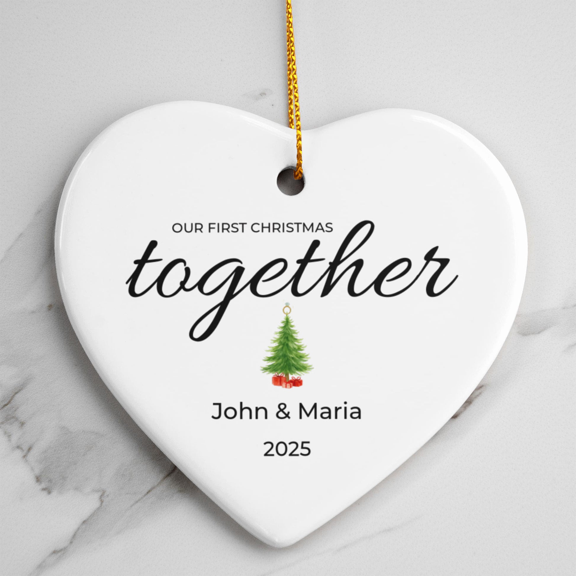 Our First Christmas Together Personalized Heart Ornament – Custom Names (Acrylic or Ceramic)