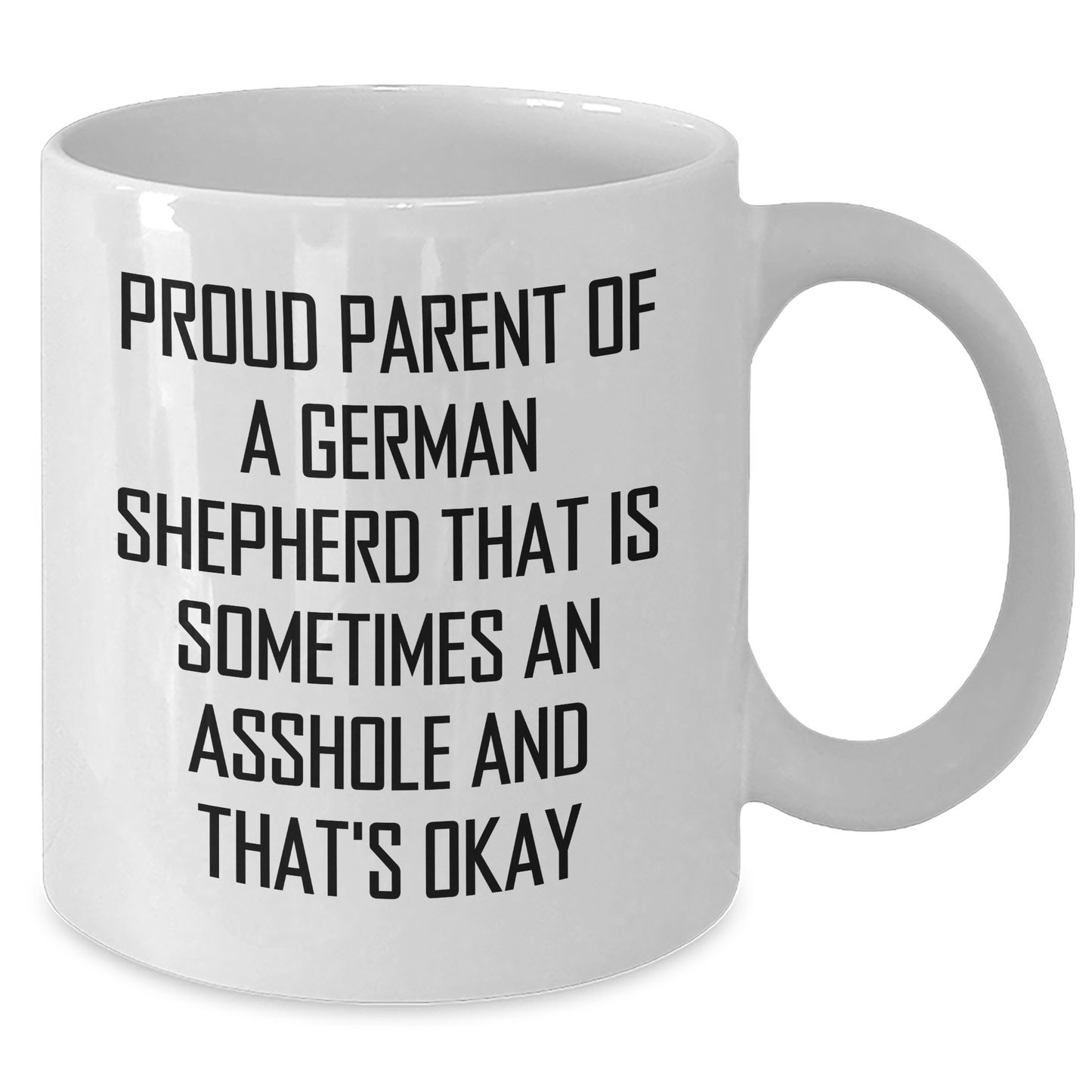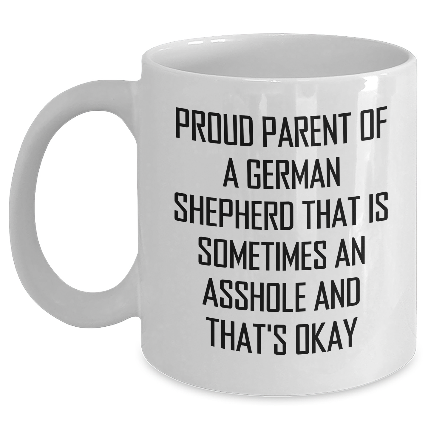 Are you a proud parent of a German Shepherd Dog that's sometimes an asshole and that's okay? Celebrate your furry friend's uniqueness with this hilarious quote coffee mug! Perfect for German Shepherd Dog enthusiasts and proud parents alike, this white coffee mug is a thoughtful gift for any occasion, especially graduation. Made from ceramic, it's microwave and dishwasher safe, making it easy to care for. Whether you're a friend, family member, or coworker, this funny coffee mug is sure to bring a smile to the face of any German Shepherd Dog lover. So why wait? Get your paws on this unique gift today!