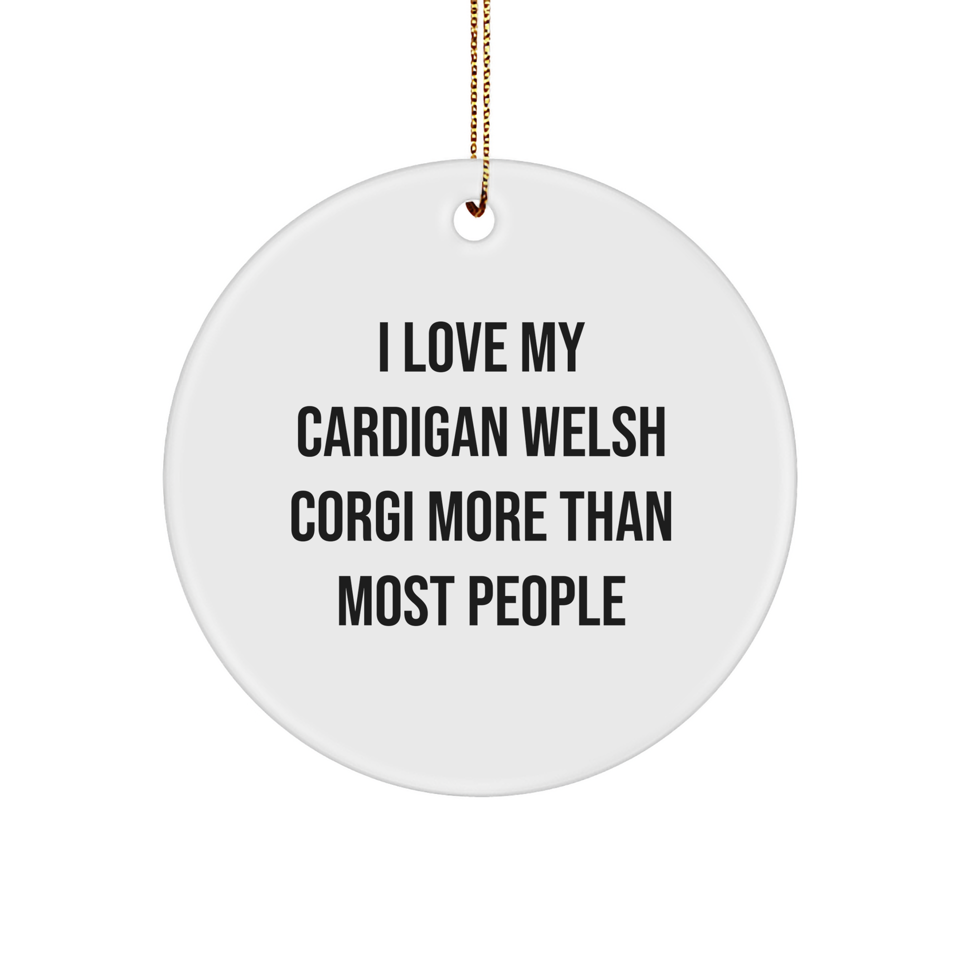 - Experience the joy of owning a Cardigan Welsh Corgi Dog with this unique Circle Ornament, perfect for any dog lover. Savor every moment with the comfort of knowing your new favorite decoration is being enjoyed by a Cardigan Welsh Corgi Dog enthusiast like you. 'I Love My Cardigan Welsh Corgi More Than Most People.' says it all - this Circle Ornament is a must-have for any Cardigan Welsh Corgi Dog parent.