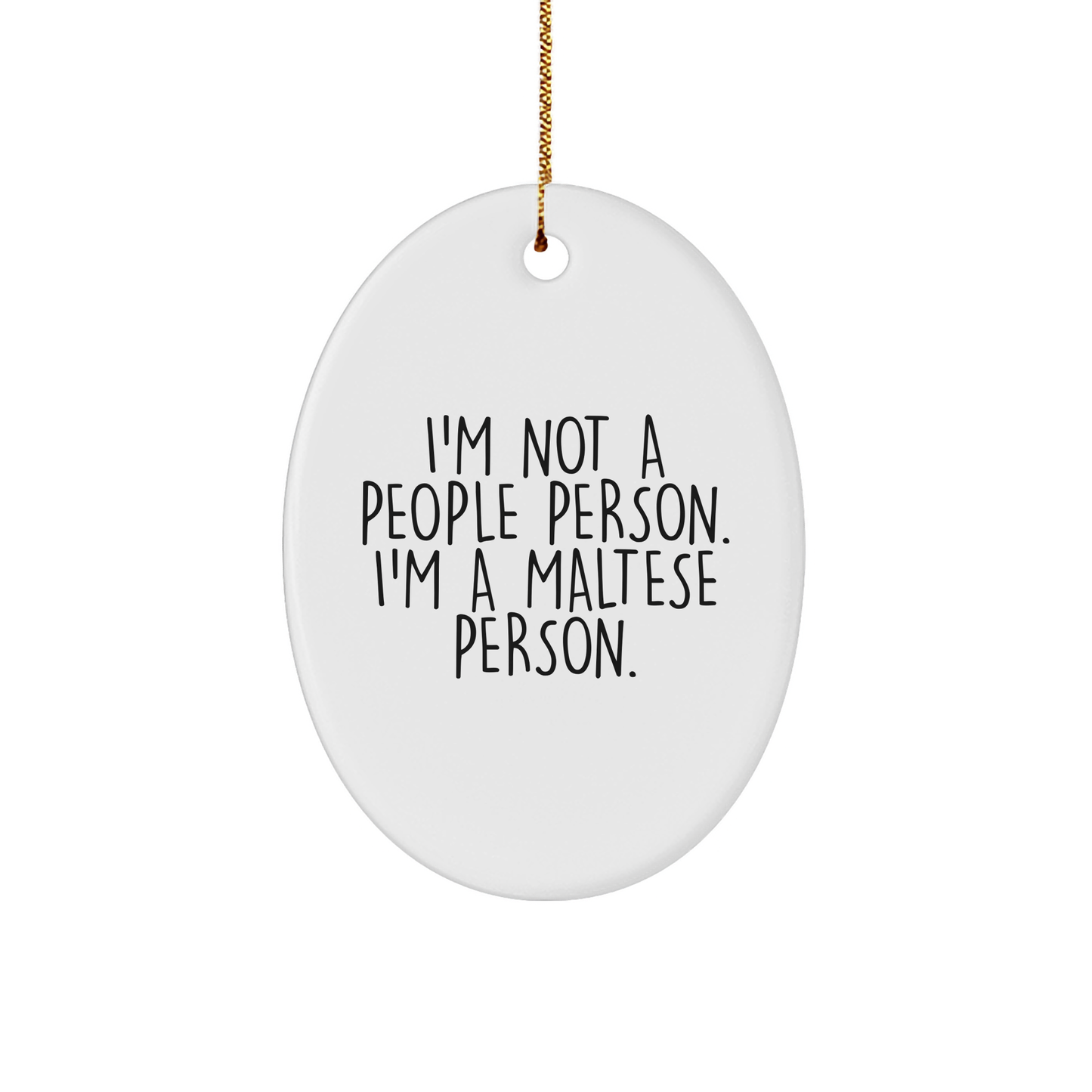 Sent by a thoughtful gift-giver to the special Maltese Dog in your life, this ornament is sure to bring a smile to their face. Perfect for hanging on the Christmas tree, placing on a shelf, or giving as a unique keepsake. The 'I'm Not A People Person. I'm A Maltese Person.' quote adds a touch of humor and personality to this already delightful gift.