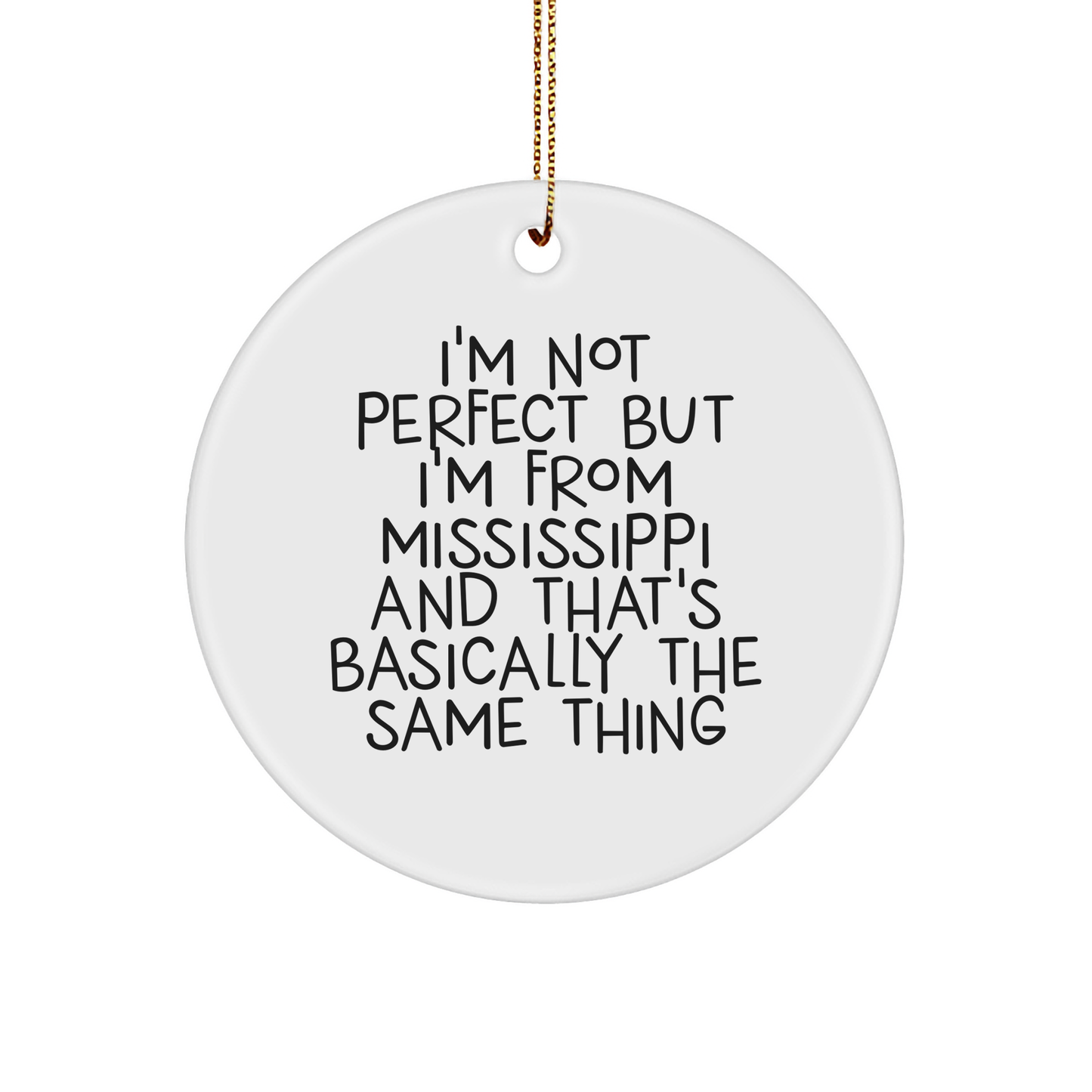 - Start your holiday decor with a touch of Mississippi charm and a dash of humor with our Mississippi Charm Circle Ornament, featuring the quote 'I'm Not Perfect But I'm From Mississippi And That's Basically The Same Thing'. Made from sturdy MDF with a high-gloss plastic finish, this ornament is lightweight and resistant to breaking, making it a great choice for households with children or pets.