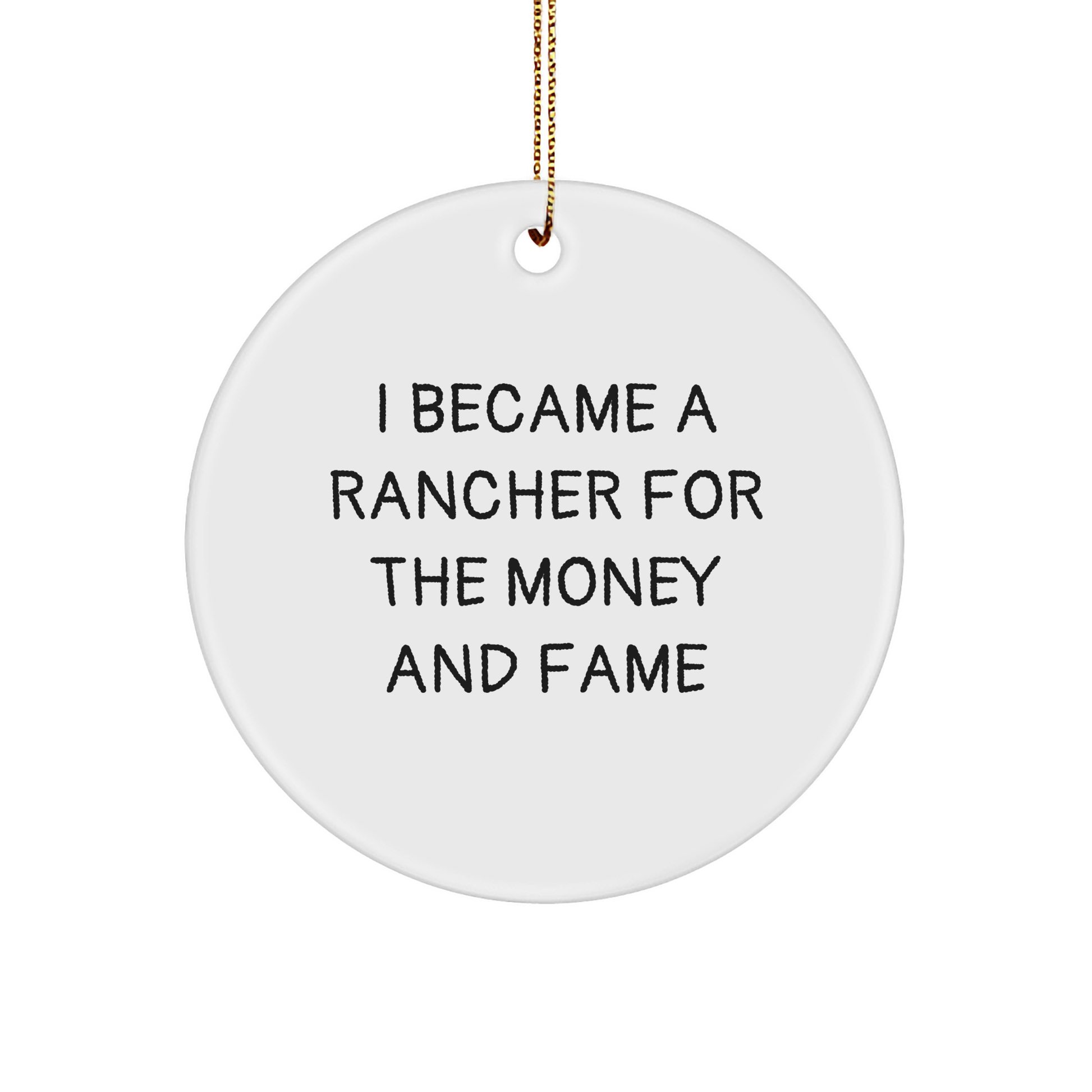 - Unique and humorous Circle Ornament featuring the quote 'I Became A Rancher For The Money And Fame' - a great gift for any Rancher enthusiast or a funny addition to your own home decor