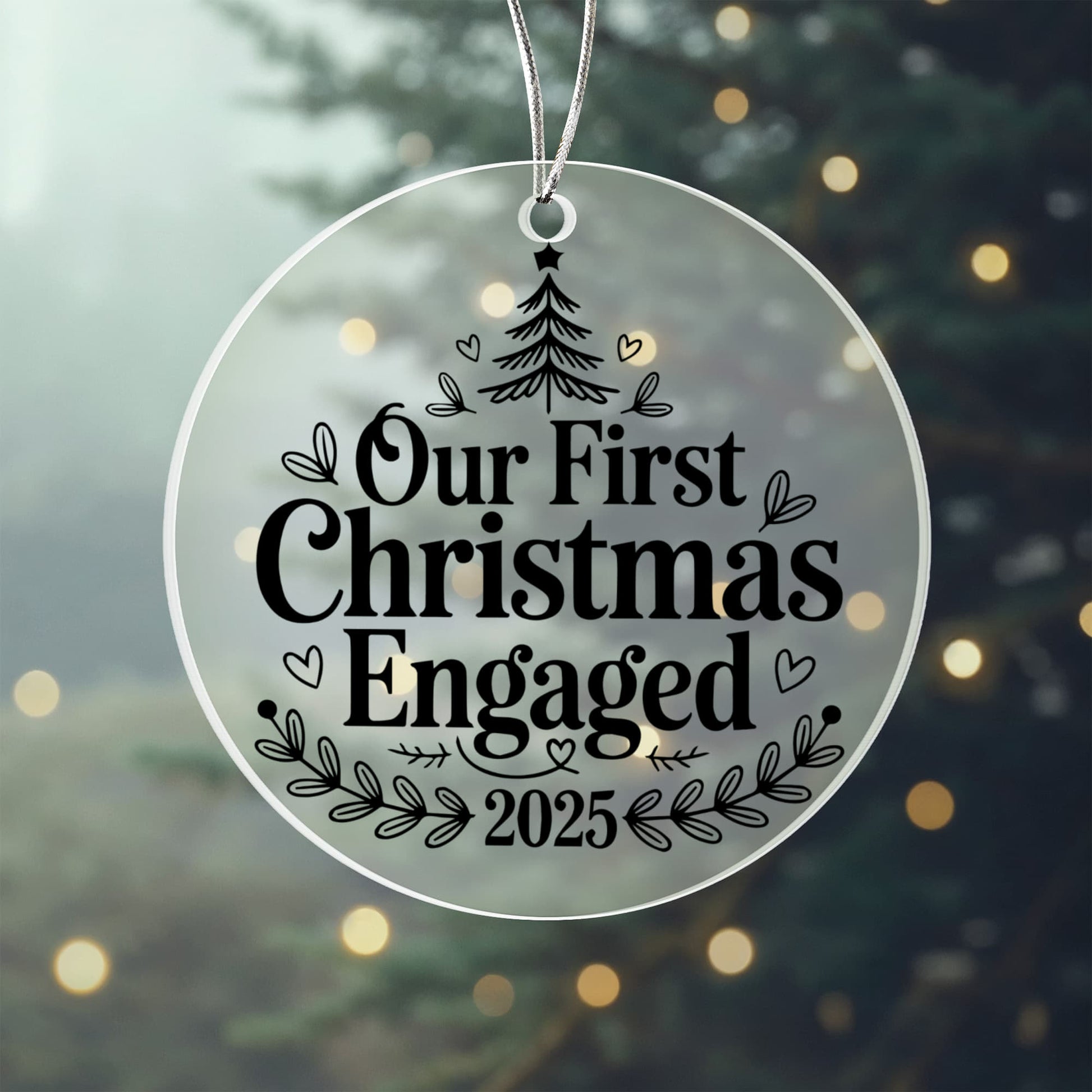 Crafted from premium clear acrylic, this ornament has a sleek, glass-like finish that catches the light beautifully on your Christmas tree. The vibrant UV printing ensures crisp detail and lasting color, while the silver hanging cord adds a touch of holiday elegance. Measuring 3" x 3", it’s the ideal size to display proudly or gift to a newly engaged couple.