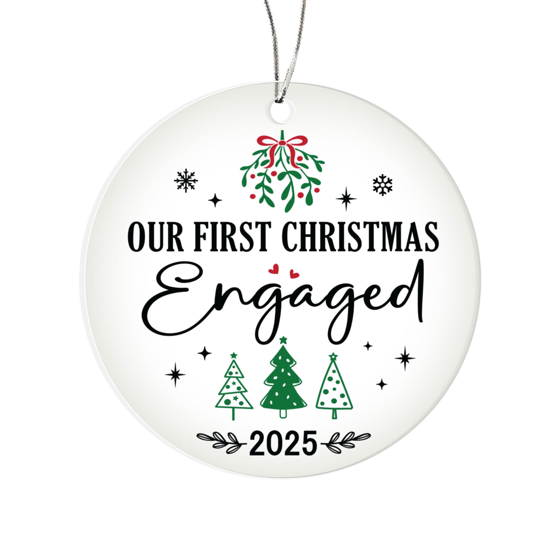 Celebrate your engagement and your first Christmas together with this beautifully festive keepsake. Featuring a joyful design with mistletoe, Christmas trees, and sparkling accents, our Our First Christmas Engaged 2025 ornament perfectly captures the excitement of saying “Yes!”