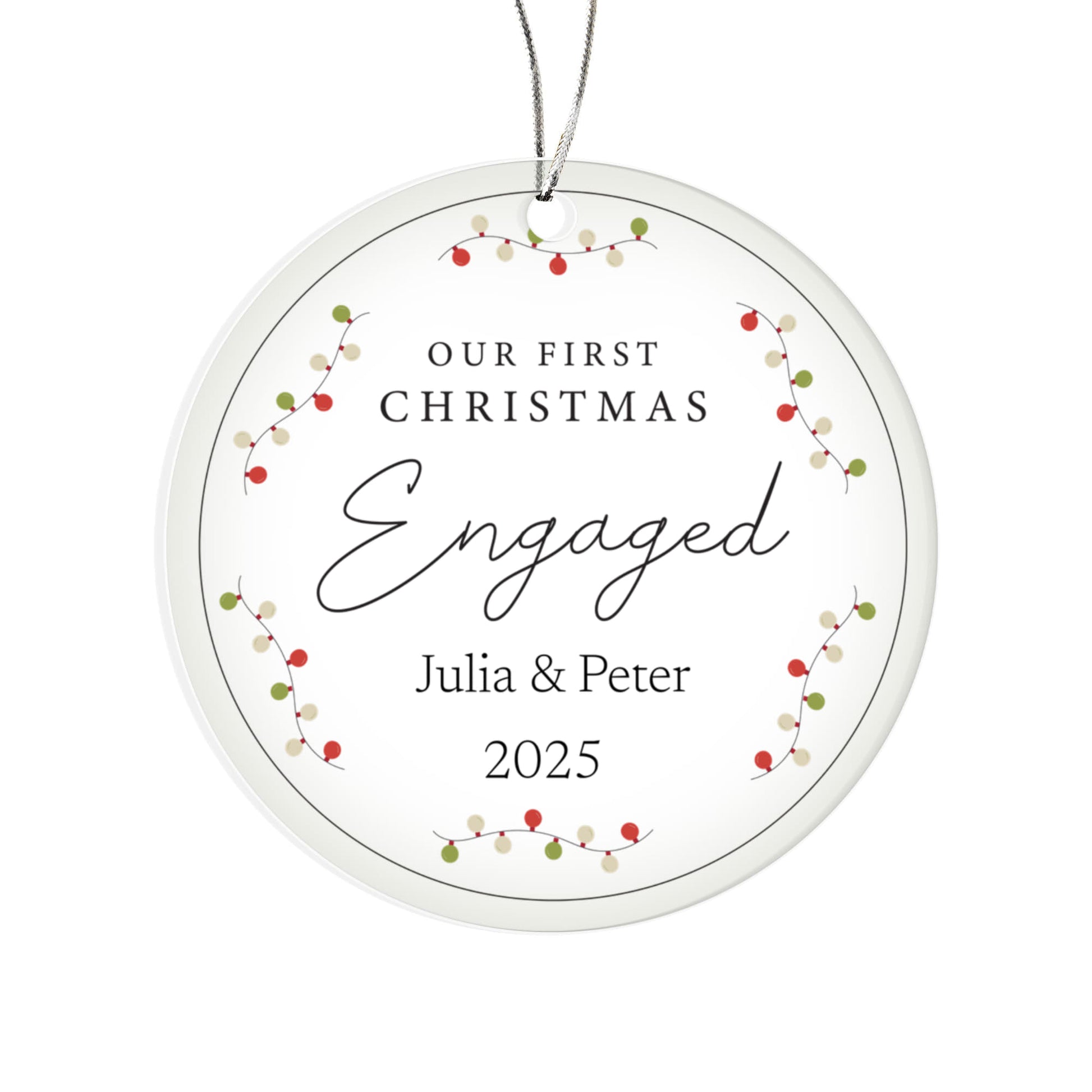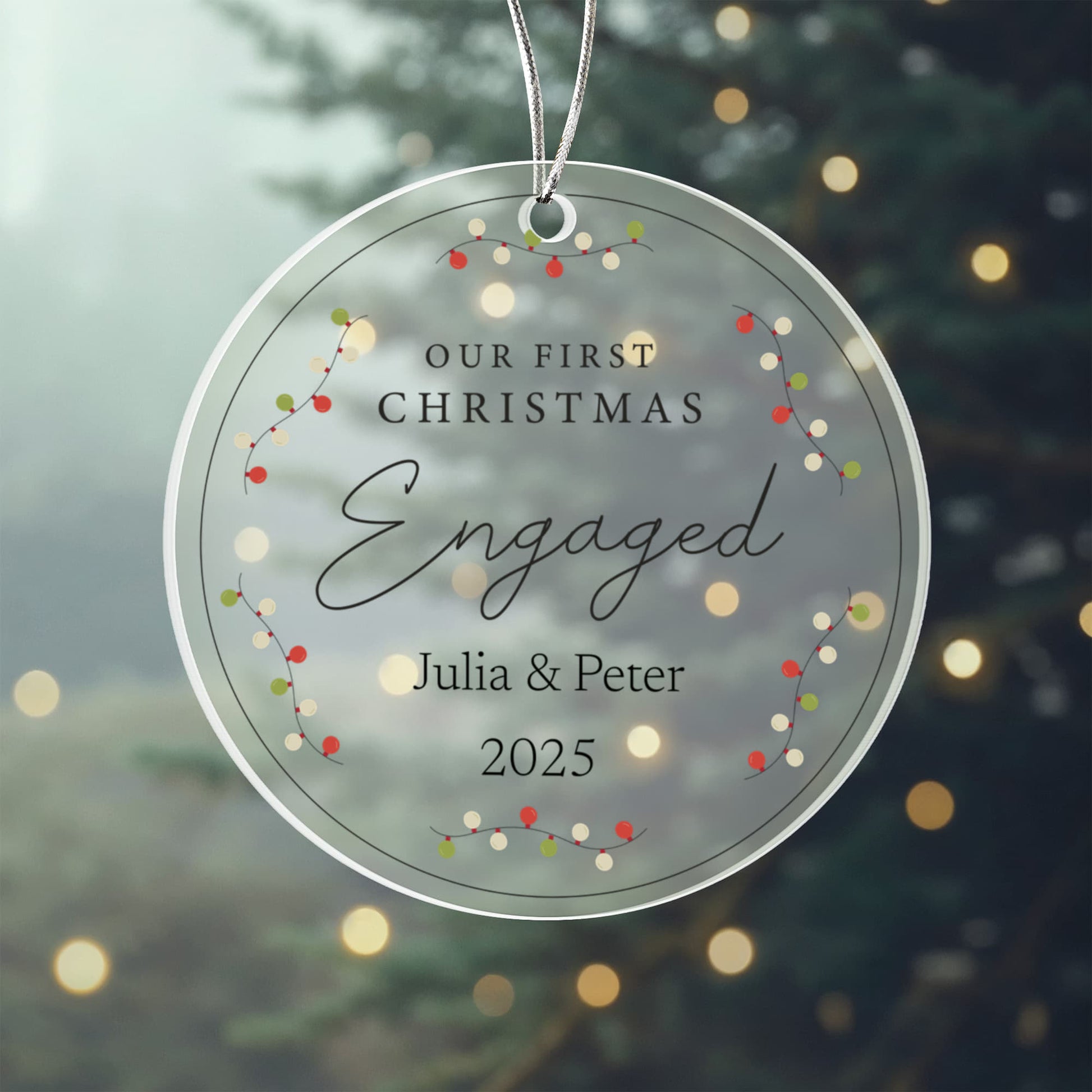 Our First Christmas Engaged Personalized Ornament – Custom Names (Acrylic or Ceramic)